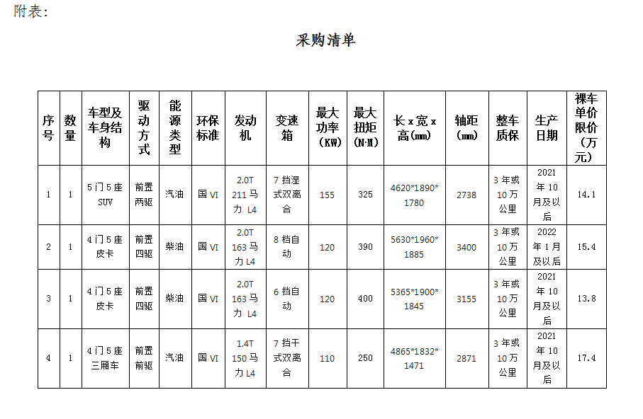 1.根據(jù)業(yè)務(wù)發(fā)展需要,滁州市興元商貿(mào)有限公司擬集中采購業(yè)務(wù)保障車輛共計(jì)4輛,詳情見附表。