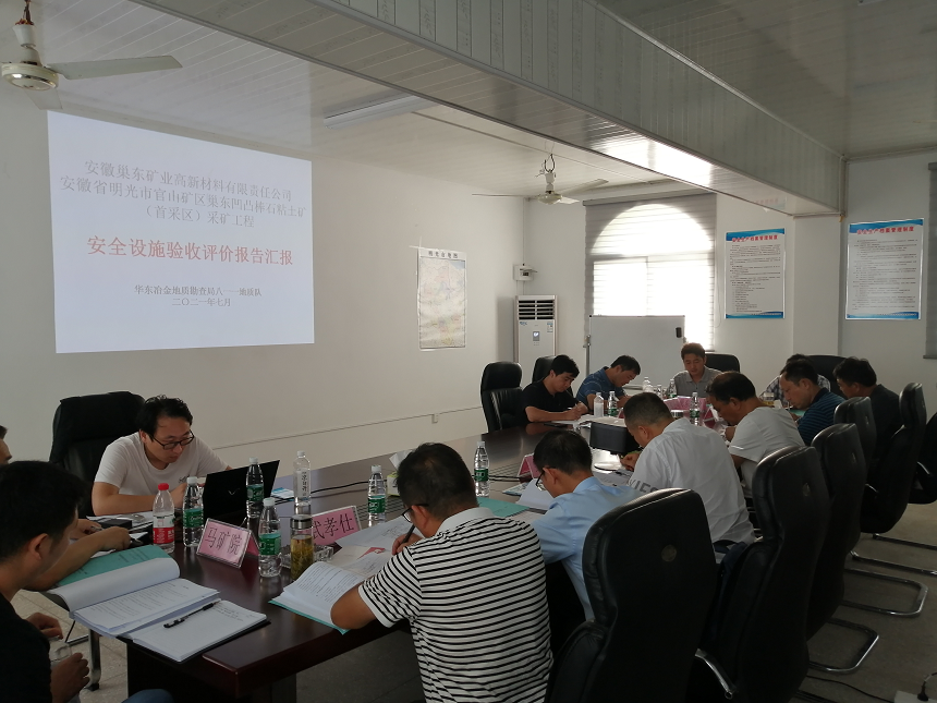 會議前專家組一行前往巢東礦區(qū)首采區(qū)逐一查看安全設施的建設情況,隨后在會議室分別聽取巢東礦業(yè)公司關于項目建設和試運行情況介紹、瑯琊山礦業(yè)工程公司關于項目建設施工情況介紹、華東冶金勘查局八一一地質隊關于《安全設施驗收評價報告》的介紹,期間專家組針對現(xiàn)場、驗收評價報告以及其他軟件資料給予充分的認可,同時對存在的問題進行點評,并要求驗收評價單位對報告進一步修改、完善。